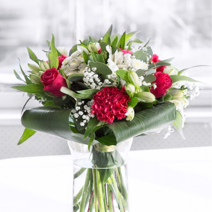 Immerse yourself in the beauty and uniqueness of our Blossoming Beauty Bouquet. This exquisite arrangement features sweet white chrysanthemums, airy gypsophila, rich red roses, vibrant carnations, pristine white alstroemeria, and lush aspidistra leaves. Each flower is hand-selected to ensure superb freshness and quality.